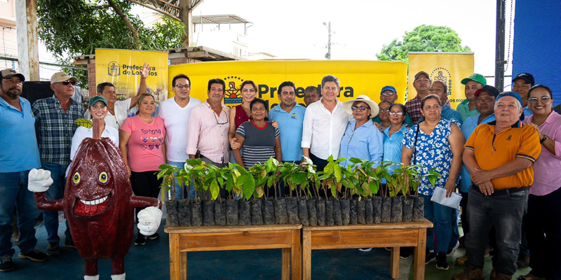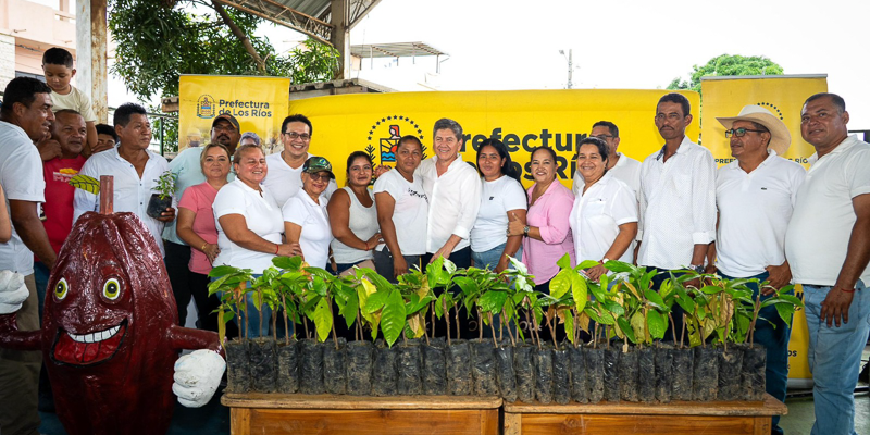 El prefecto de Los Ríos, Johnny Terán, entregó 26 000 plantas de cacao a pequeños y medianos productores del cantón Urdaneta, como parte del programa de fortalecimiento de la productividad cacaotera que se ejecuta durante el presente año, con una inversión de USD 282 600 y una cobertura total de 610 000 plantas a nivel provincial.