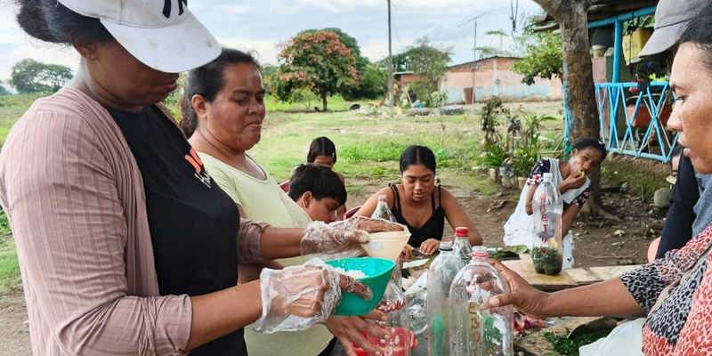 Con el acompañamiento técnico del equipo de Desarrollo Agropecuario, se promovió el uso de prácticas sostenibles, así como el aprovechamiento de materiales reciclados -entre ellos botellas plásticas- para la preparación y aplicación de los insumos. Este enfoque fortalece la implementación de huertos familiares y comunitarios destinados a la siembra y cosecha de productos orgánicos como hortalizas, verduras, legumbres, plantas medicinales y frutales de ciclo corto.